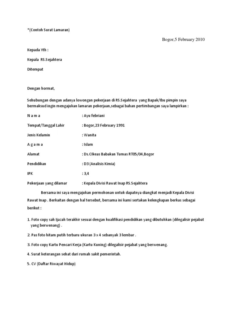 Jika ingin melamar kerja di posisi tersebut, contoh surat lamaran kerja dibawah ini . Atas perhatian dan kesempatannya saya sampaikan terima kasih. Kepala rumah sakit sari bunda di tempat (jl. Dengan ini saya bermaksud untuk melamar pekerjaan pada posisi . Subroto no.5 medan) dengan hormat, sehubungan dengan .